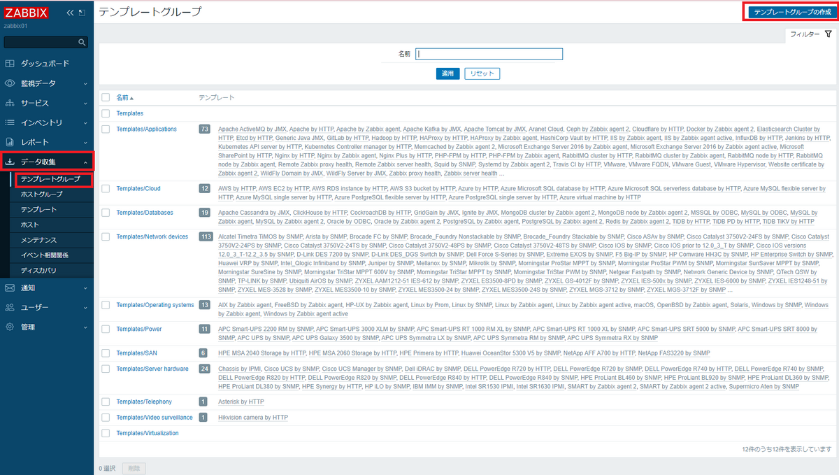 「データ収集」→「テンプレートグループ」を選択し、「テンプレートグループの作成」をクリックします。